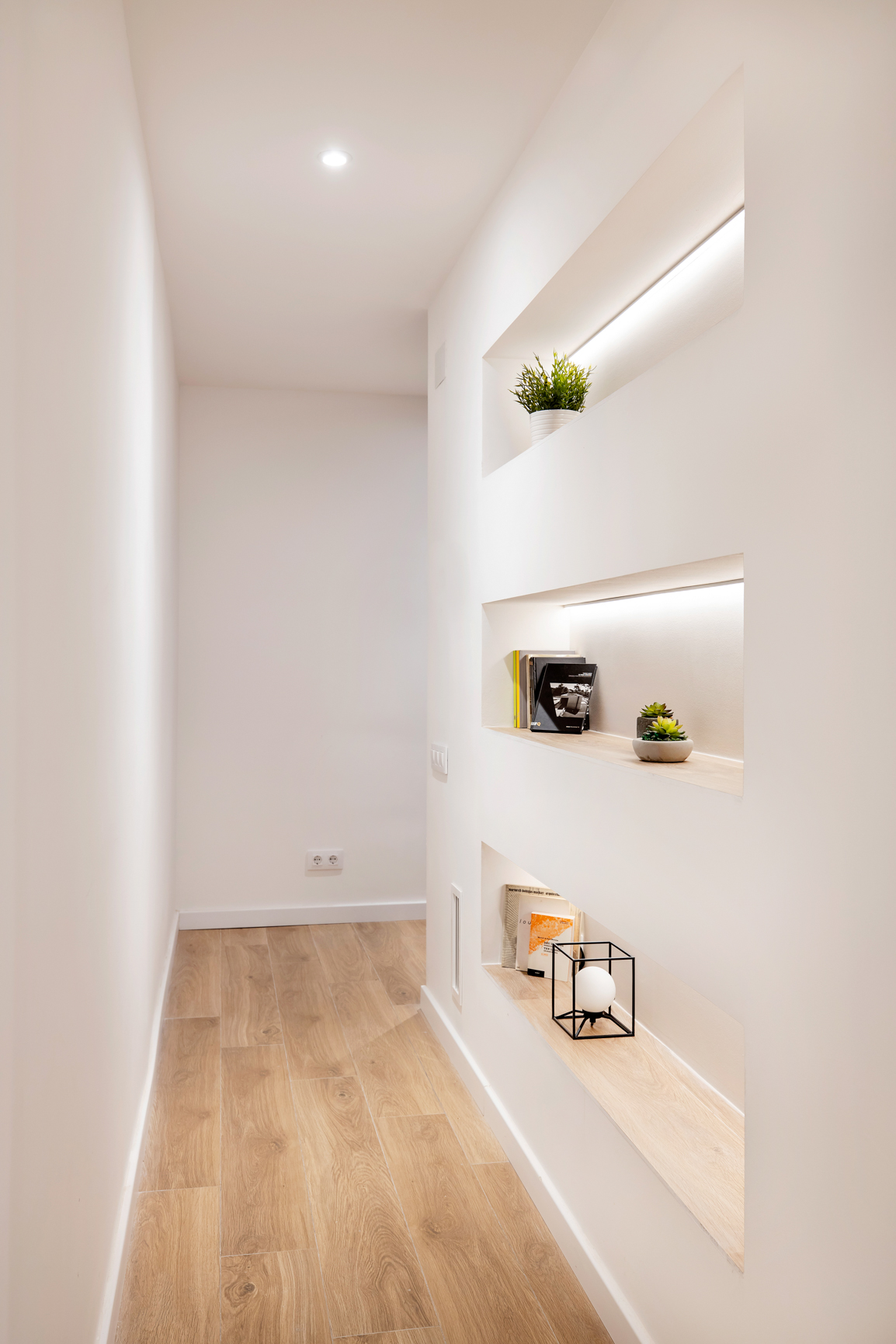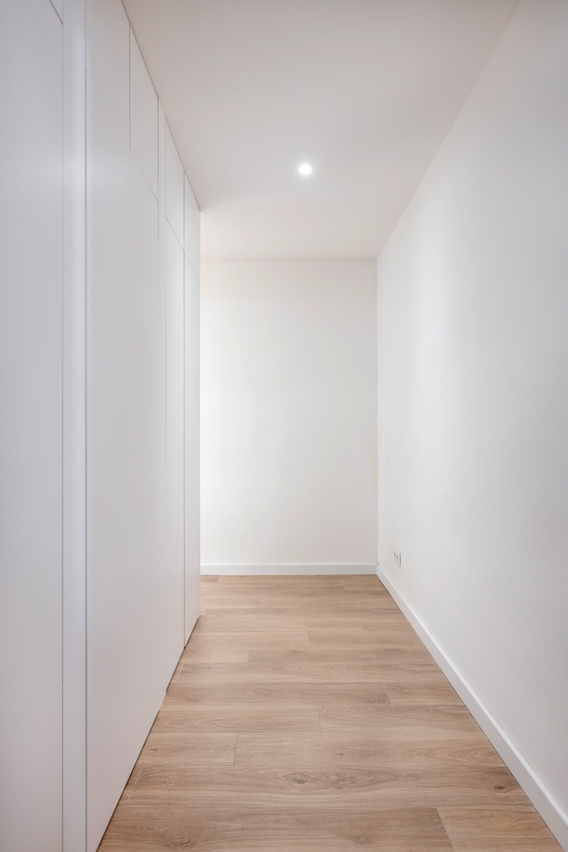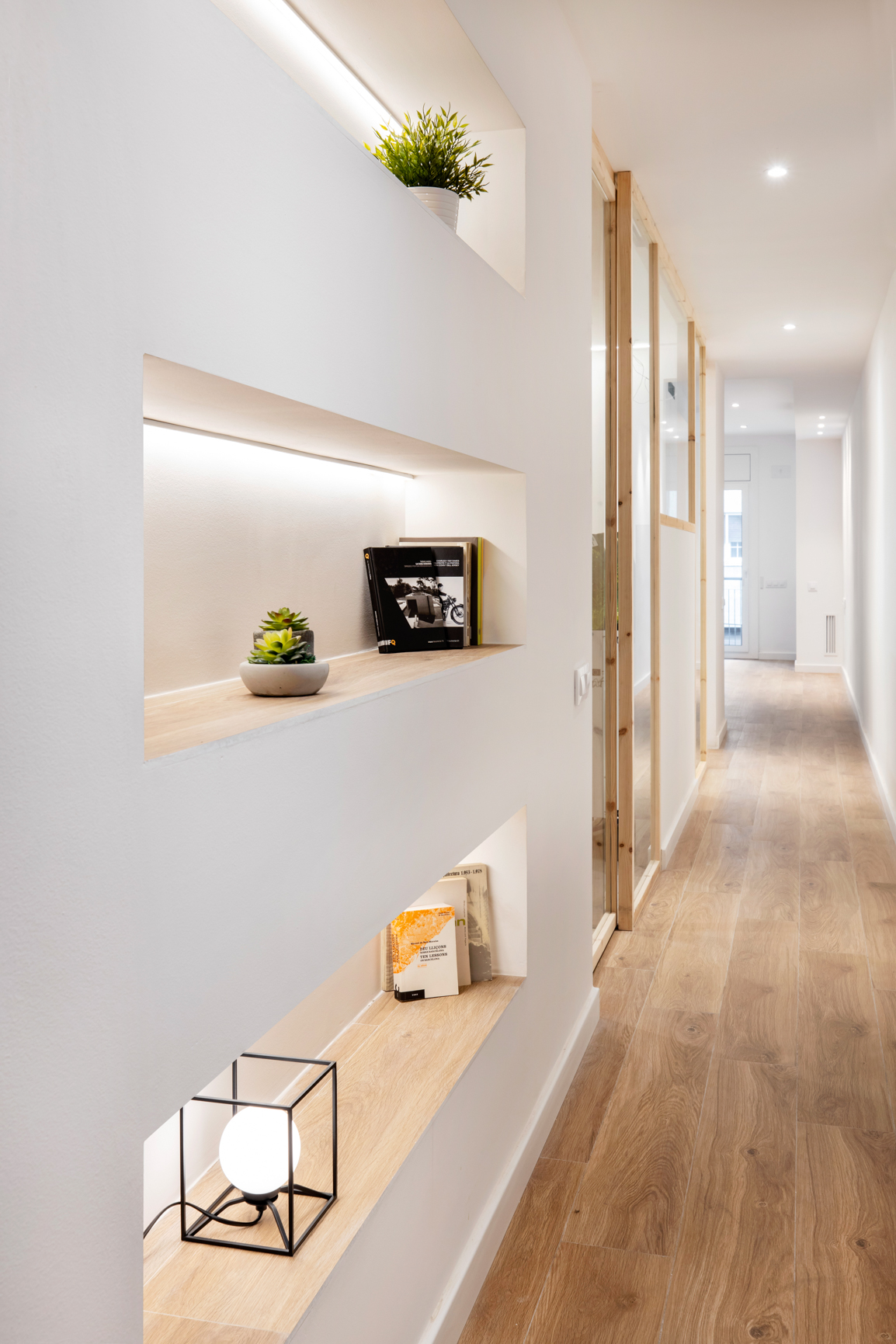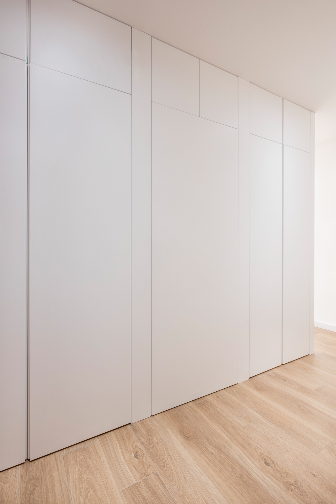 Tot l’habitatge es reforma intentant trobar espais d’emmagatzematge, sempre molt necessaris. El nou vestíbul aprofitant un mòdul d’armaris lacats en blanc integrem la porta del bany de cortesia, donant una imatge neta i endreçada a l’accés de l’habitatge.