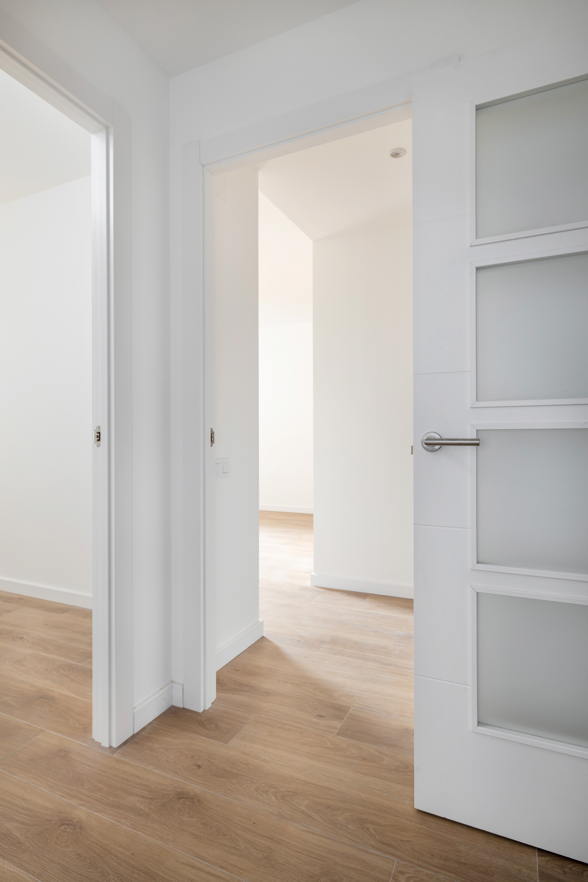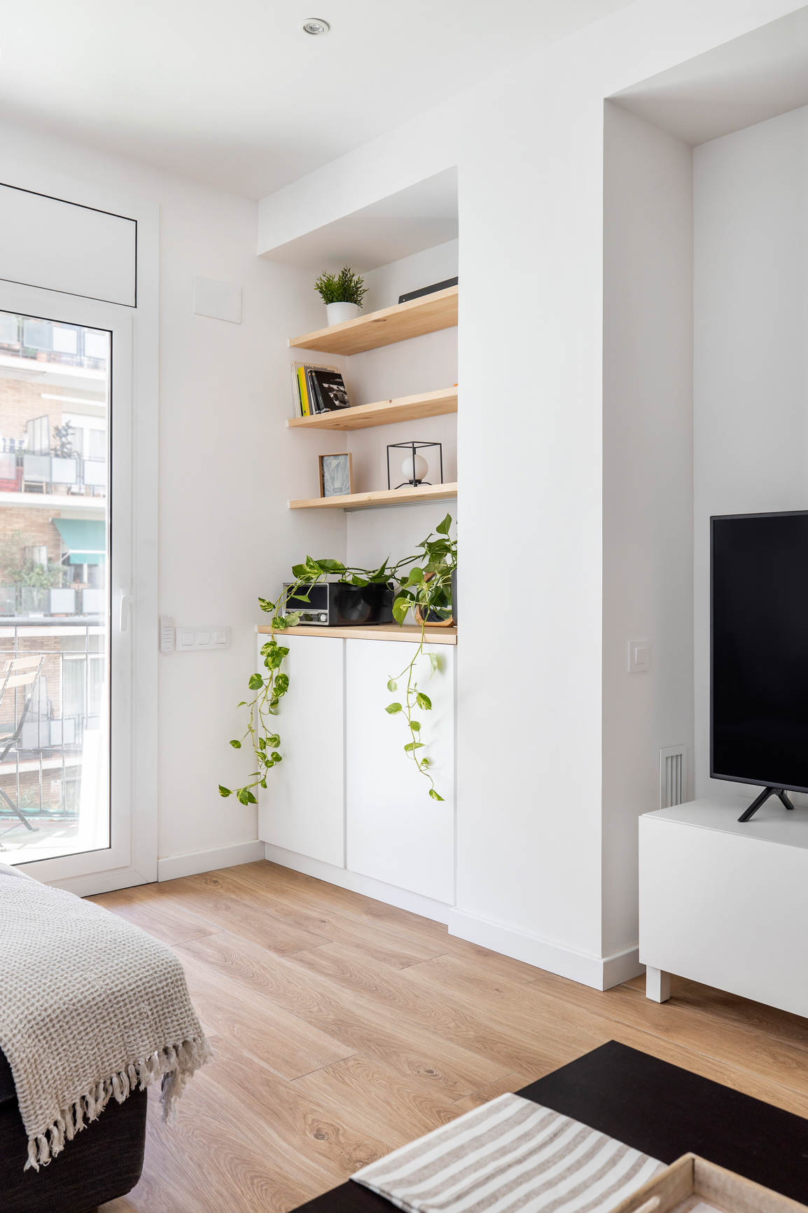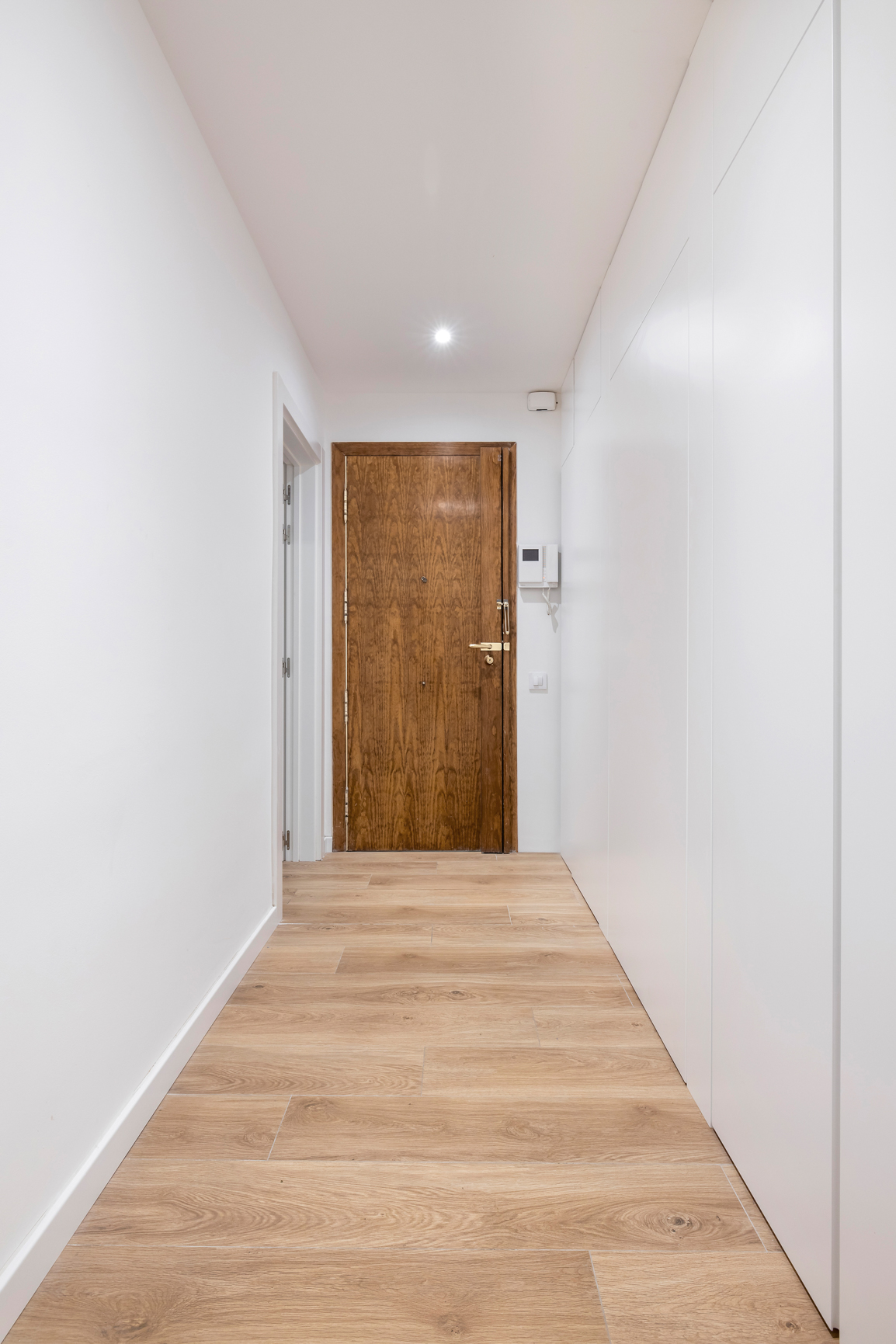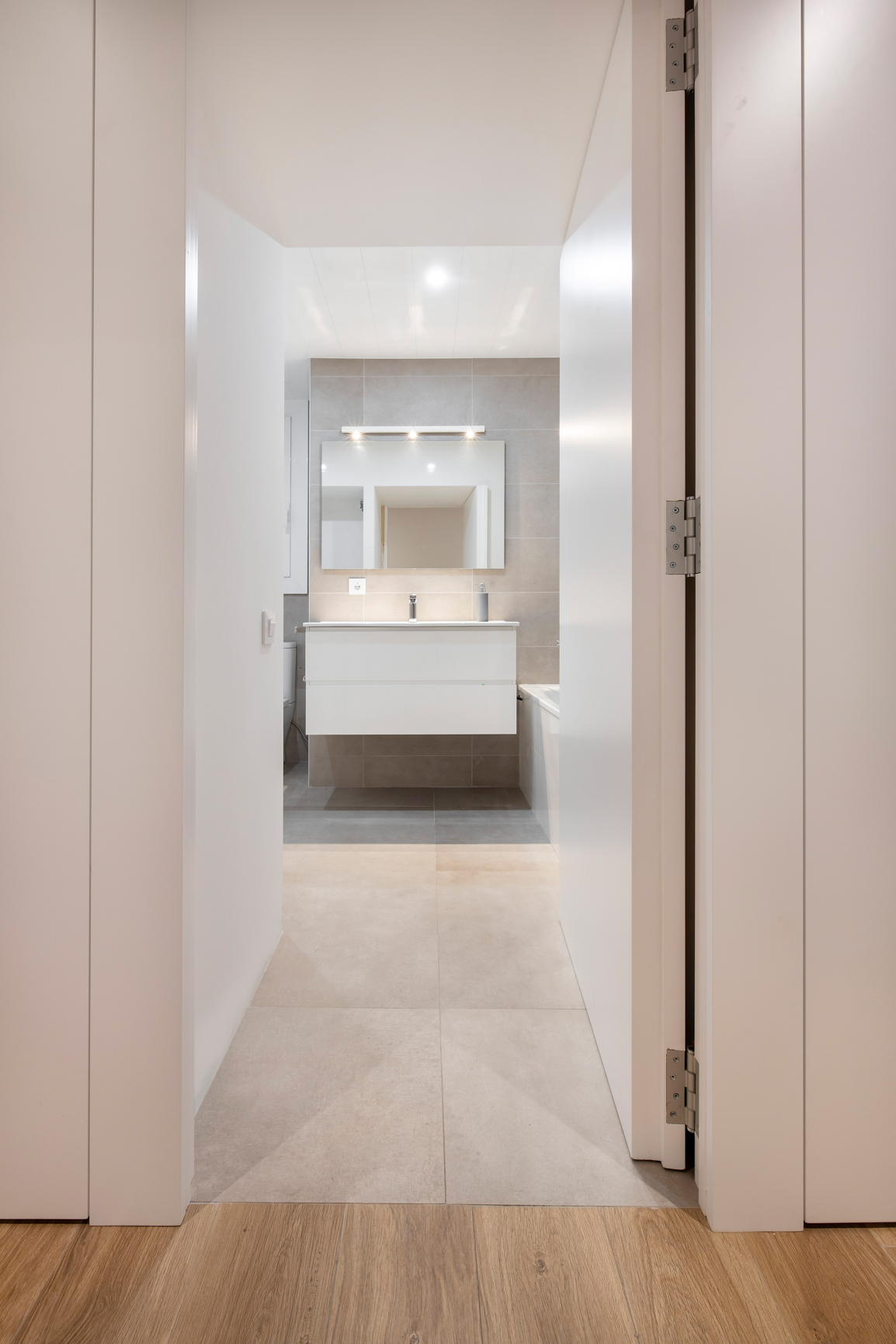 Tot l’habitatge es reforma intentant trobar espais d’emmagatzematge, sempre molt necessaris. El nou vestíbul aprofitant un mòdul d’armaris lacats en blanc integrem la porta del bany de cortesia, donant una imatge neta i endreçada a l’accés de l’habitatge.