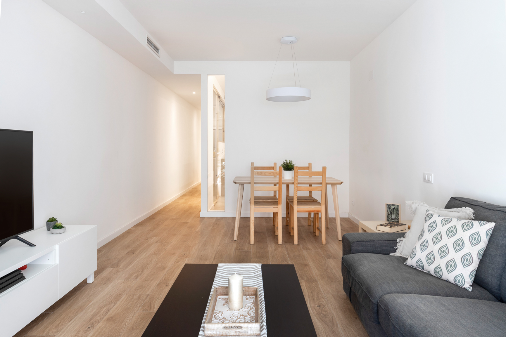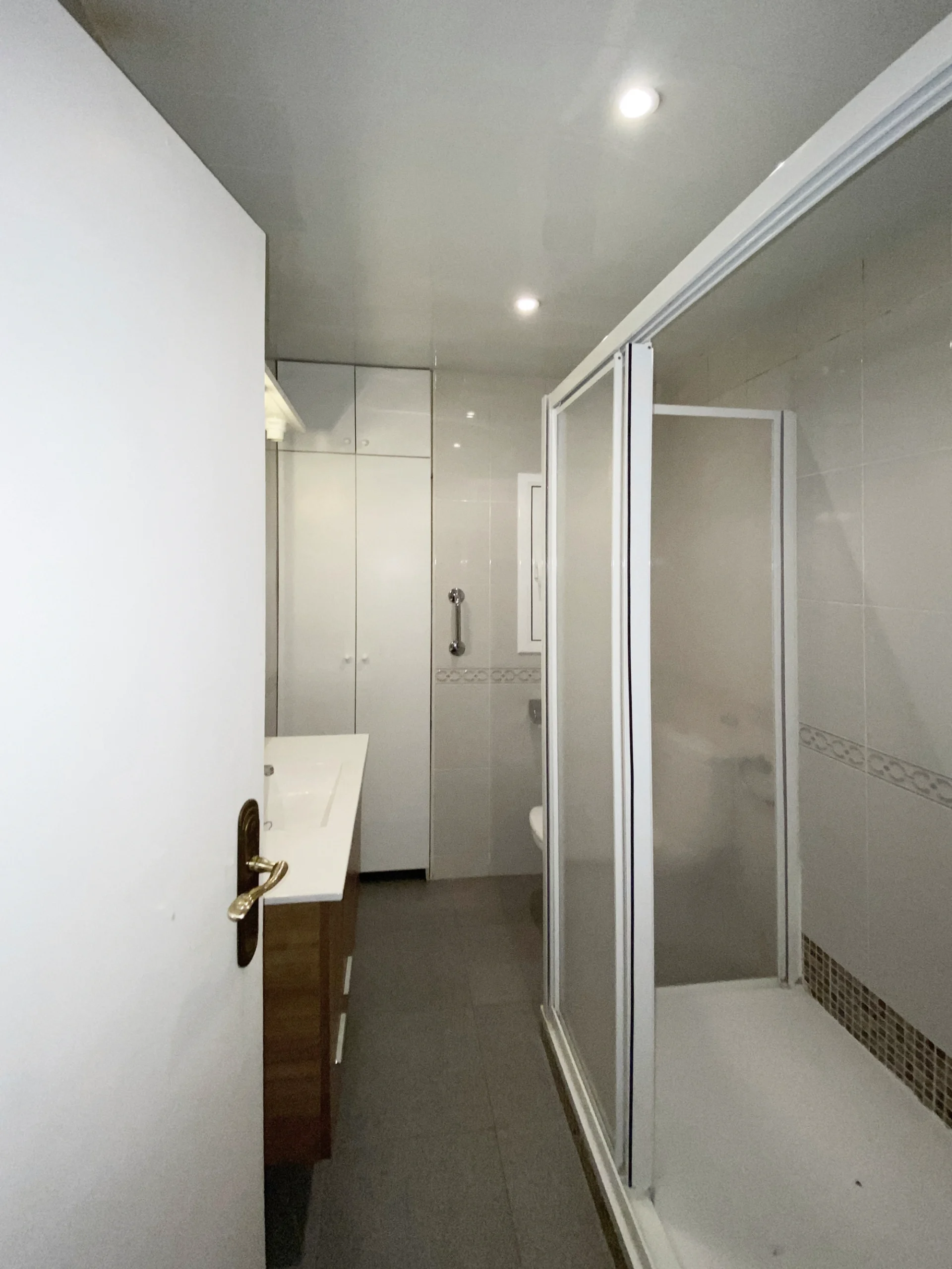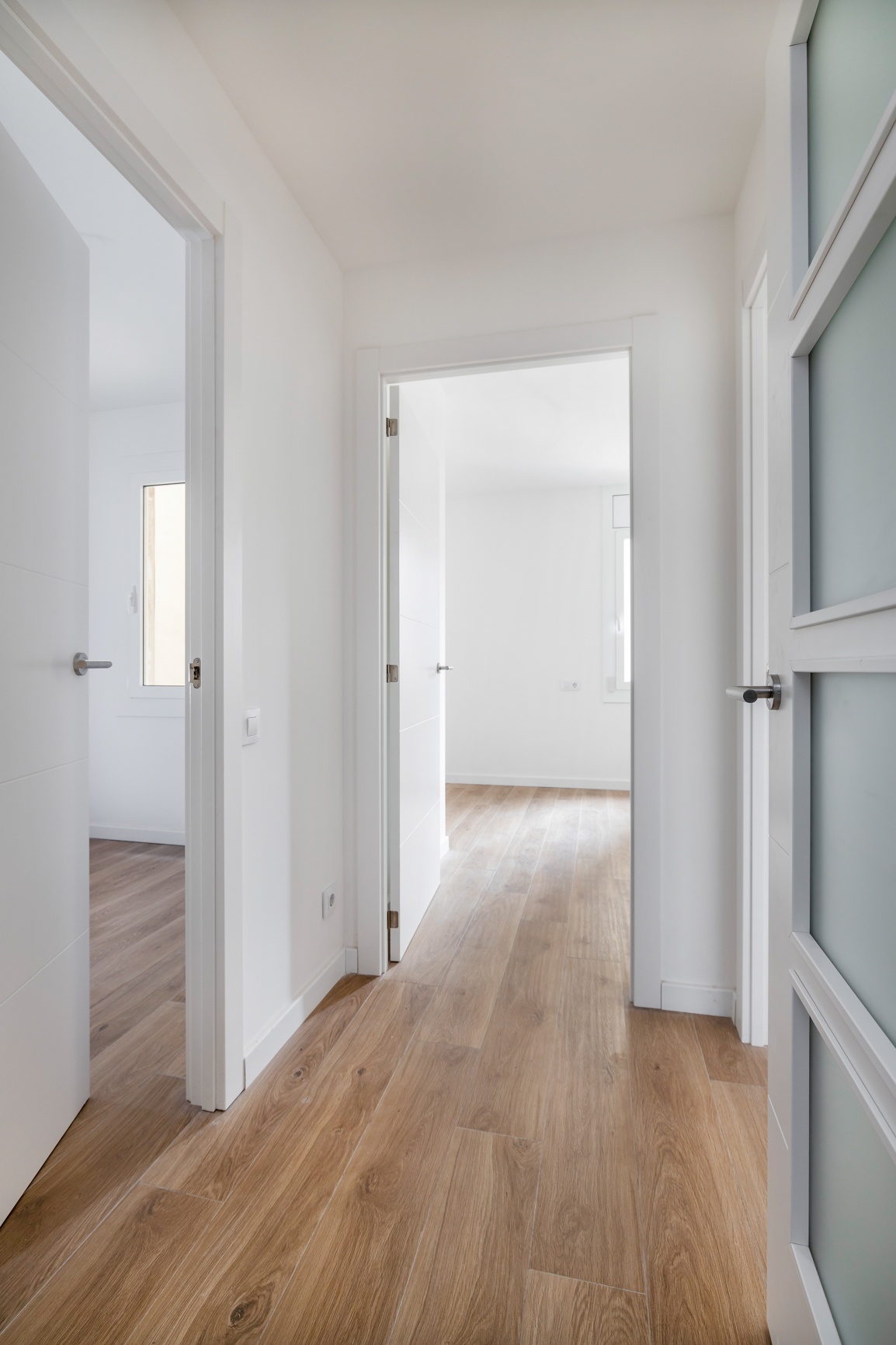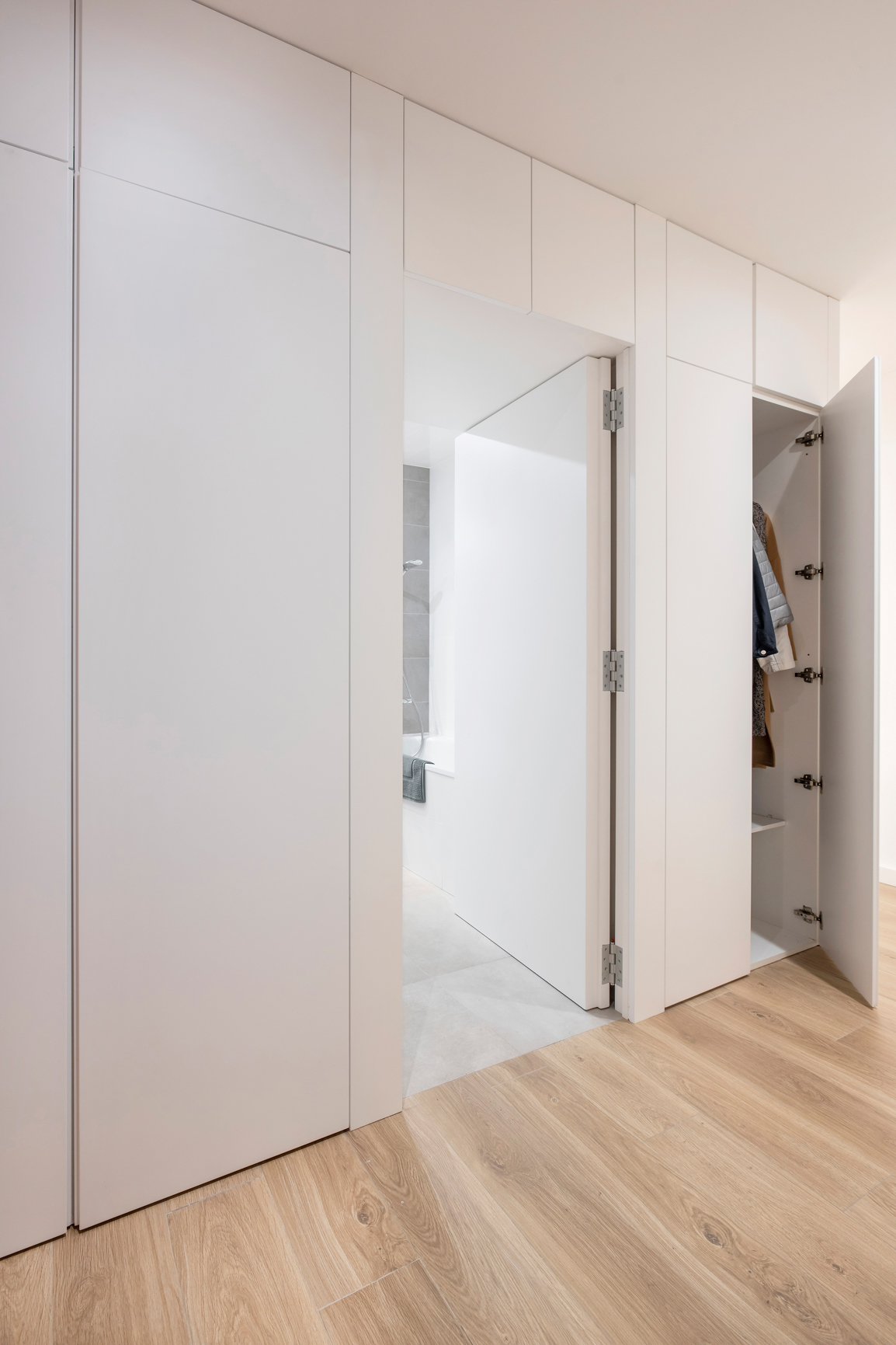 Tot l’habitatge es reforma intentant trobar espais d’emmagatzematge, sempre molt necessaris. El nou vestíbul aprofitant un mòdul d’armaris lacats en blanc integrem la porta del bany de cortesia, donant una imatge neta i endreçada a l’accés de l’habitatge.