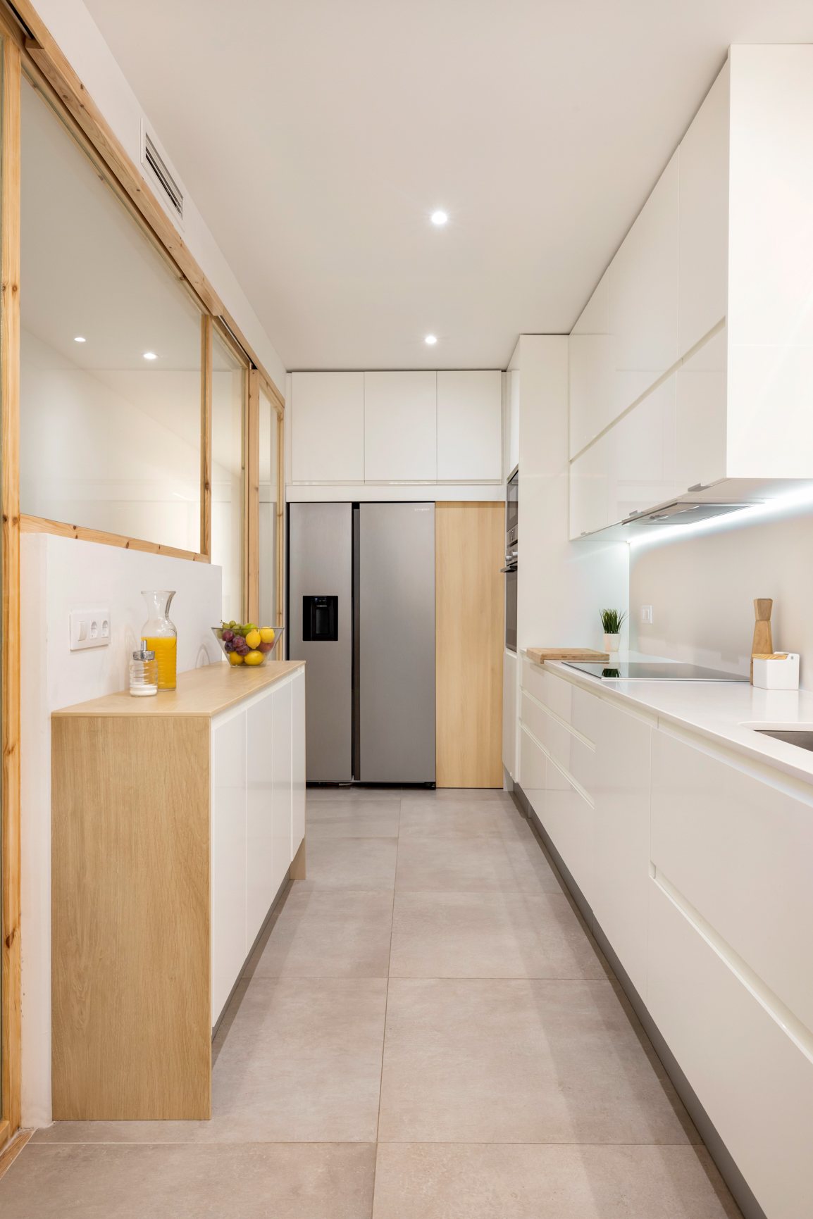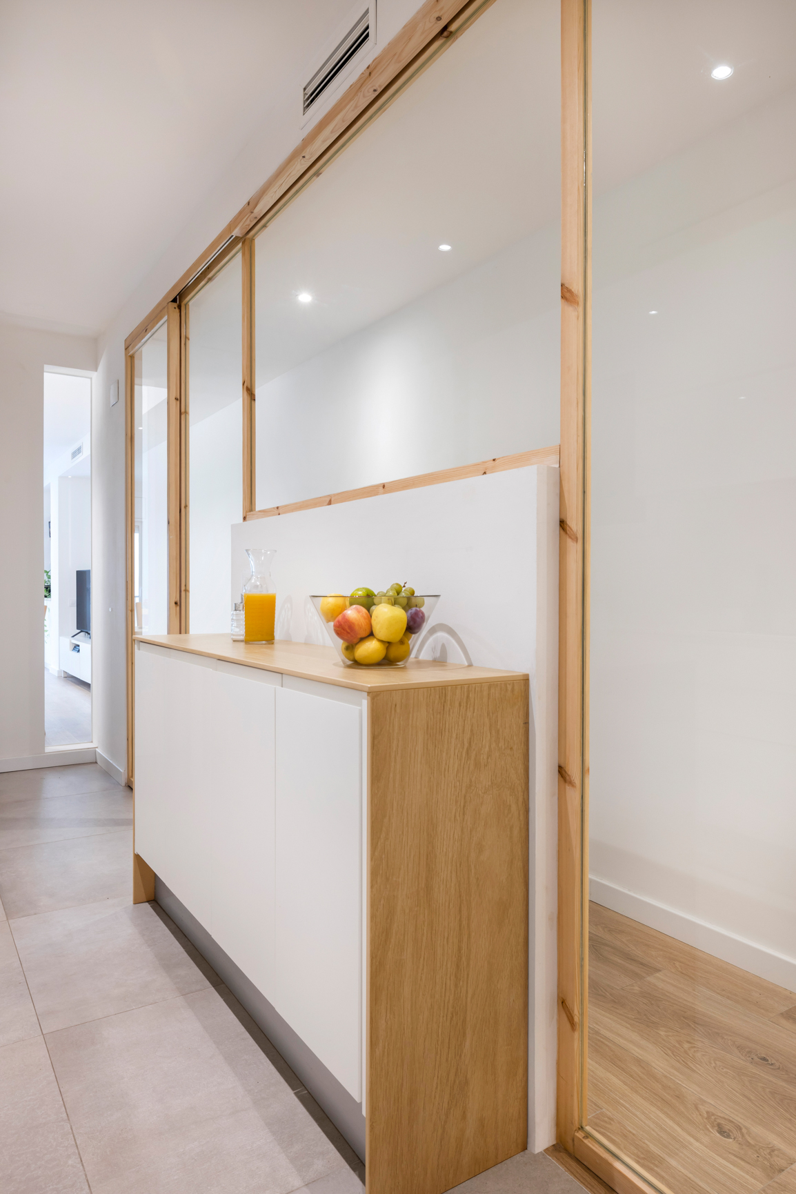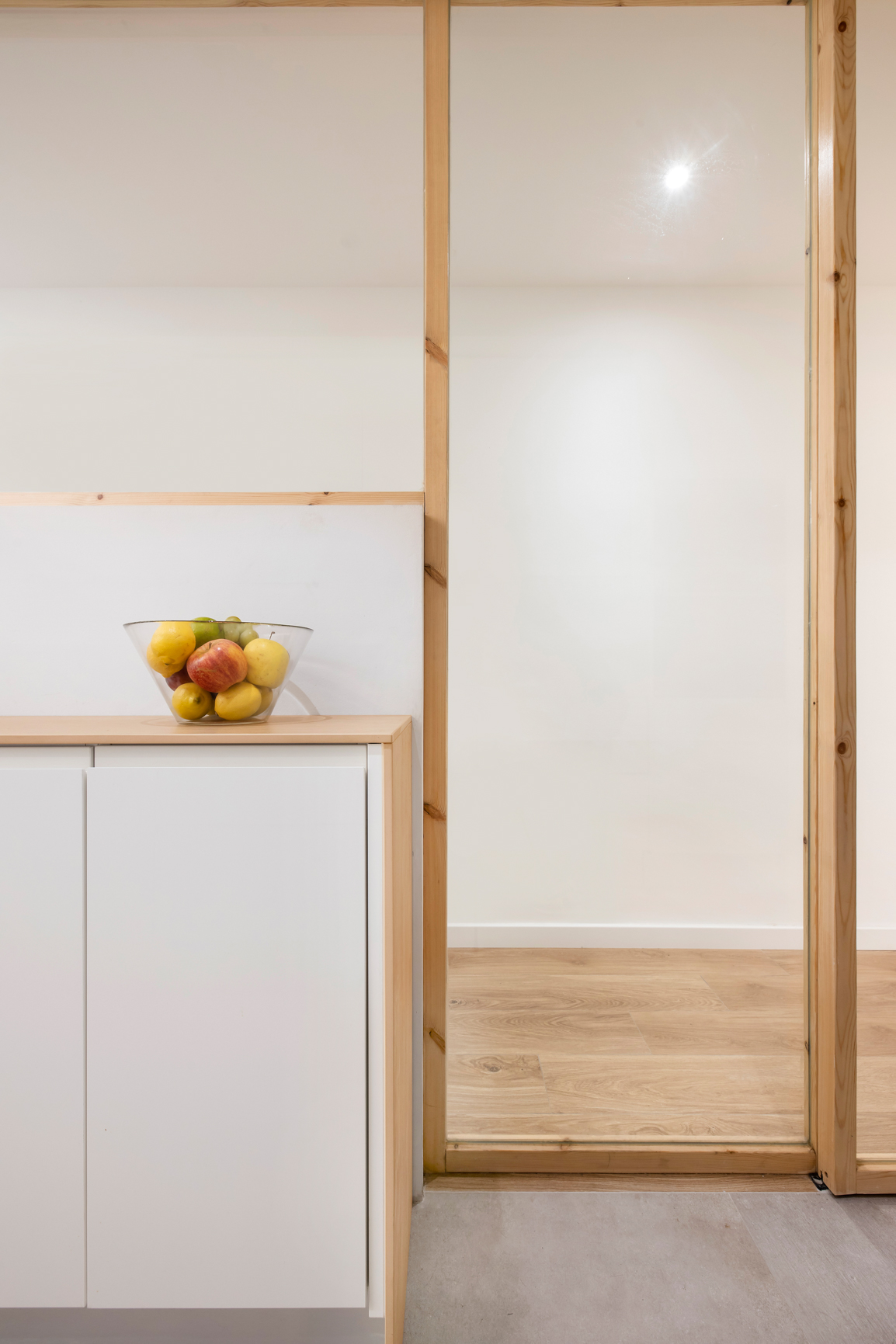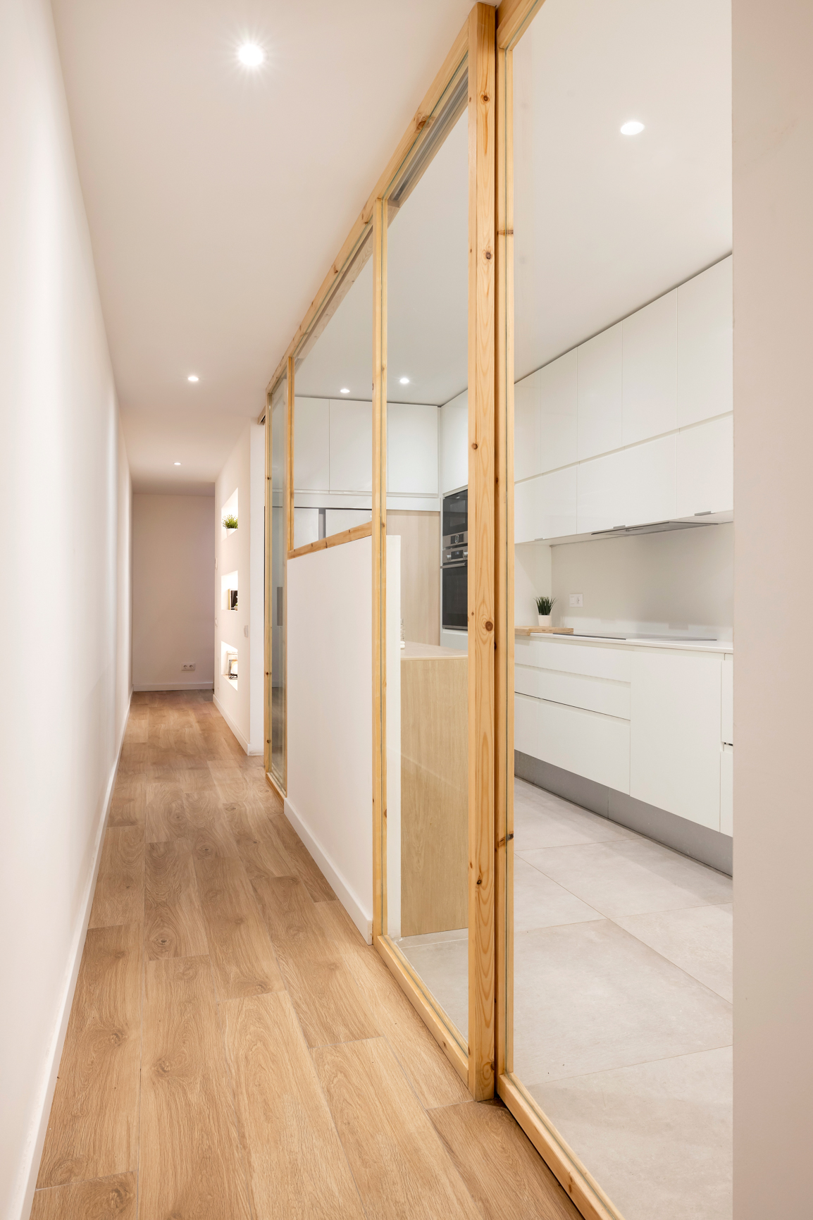La petita cuina que donava a pati interior d’edifici, s’amplia i s’obre cap a la sala i lateralment a través d’unes grans portes corredisses de vidre i fusta, obrint l’espai visualment i fent desaparèixer les parets del antic passadís. A l’únic tros restant de paret de passadís el que fem es crear una estanteria encastada convertint aquest espai de pas en un racó d’emmagatzematge amb llum indirecta col·locant-hi unes tires LED sota les baldes.