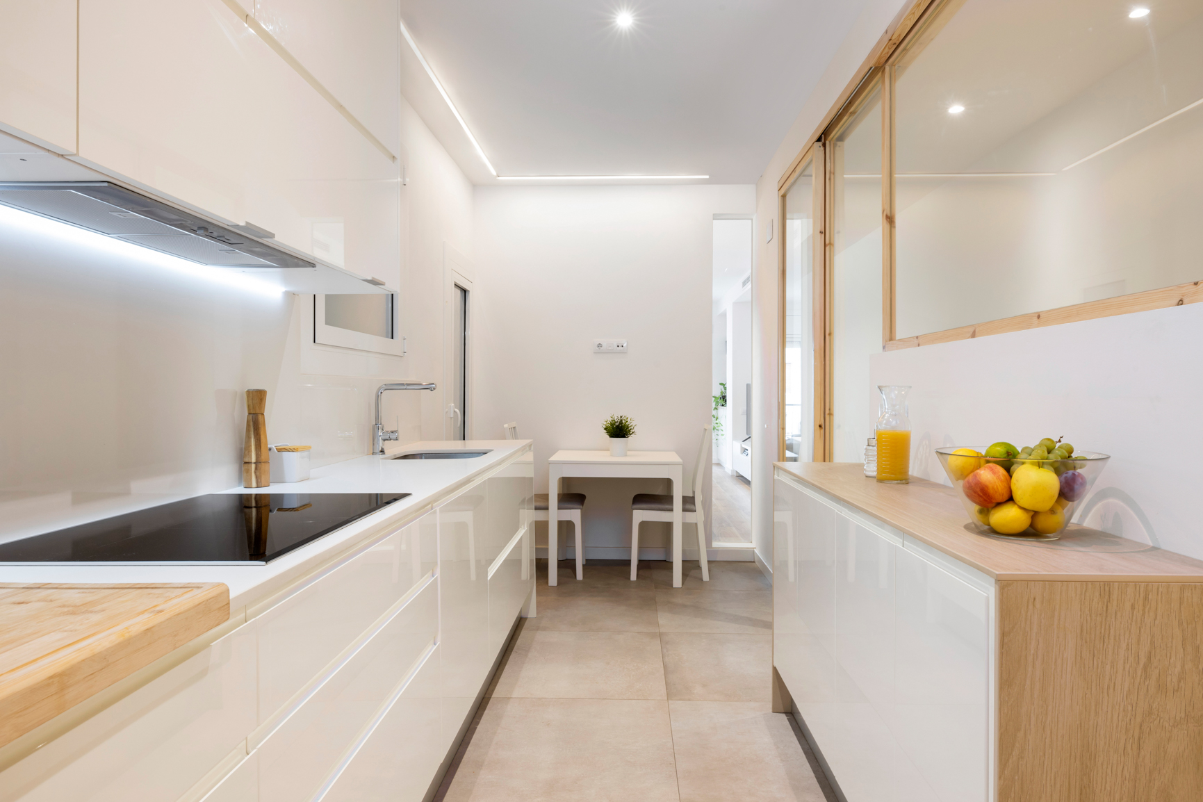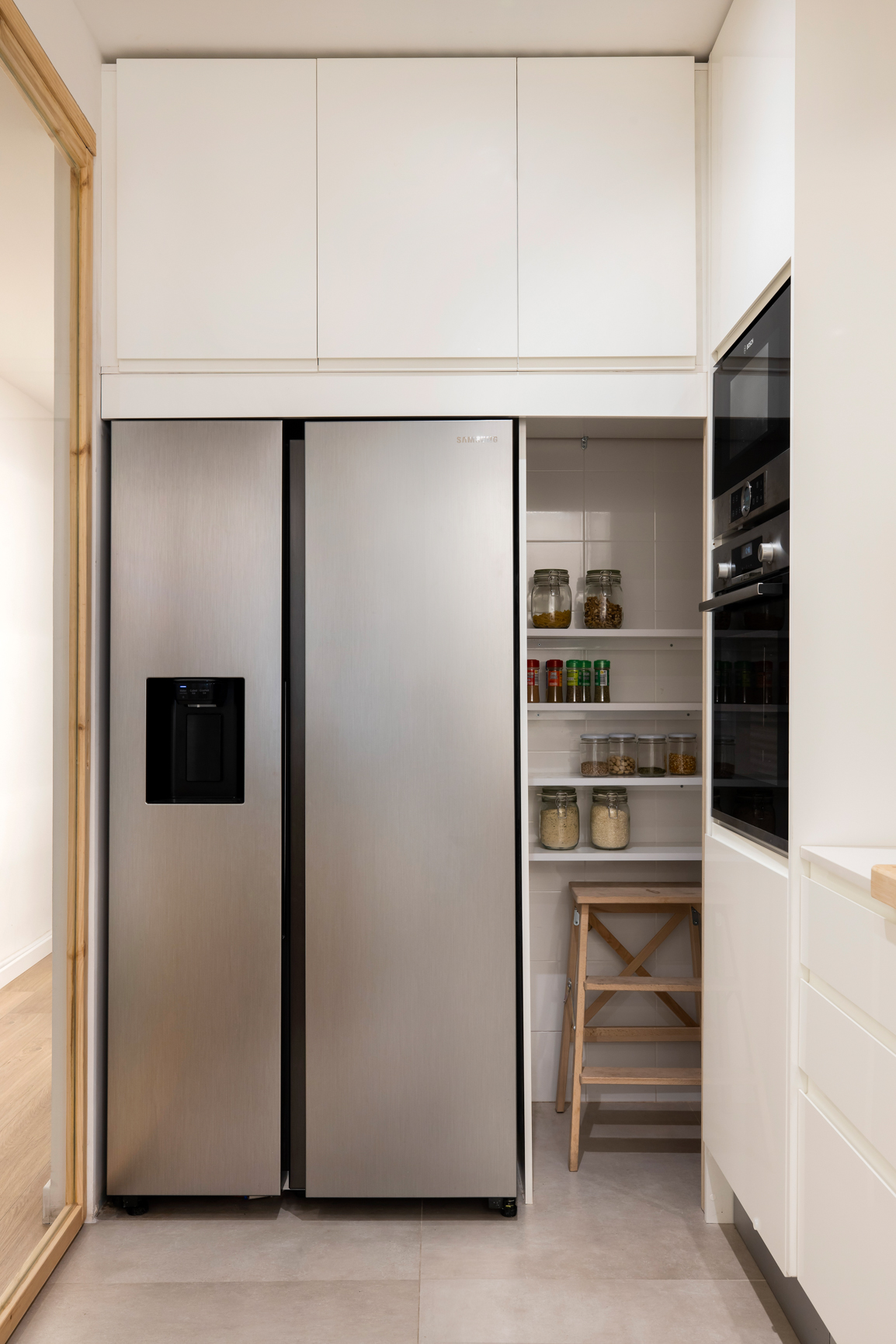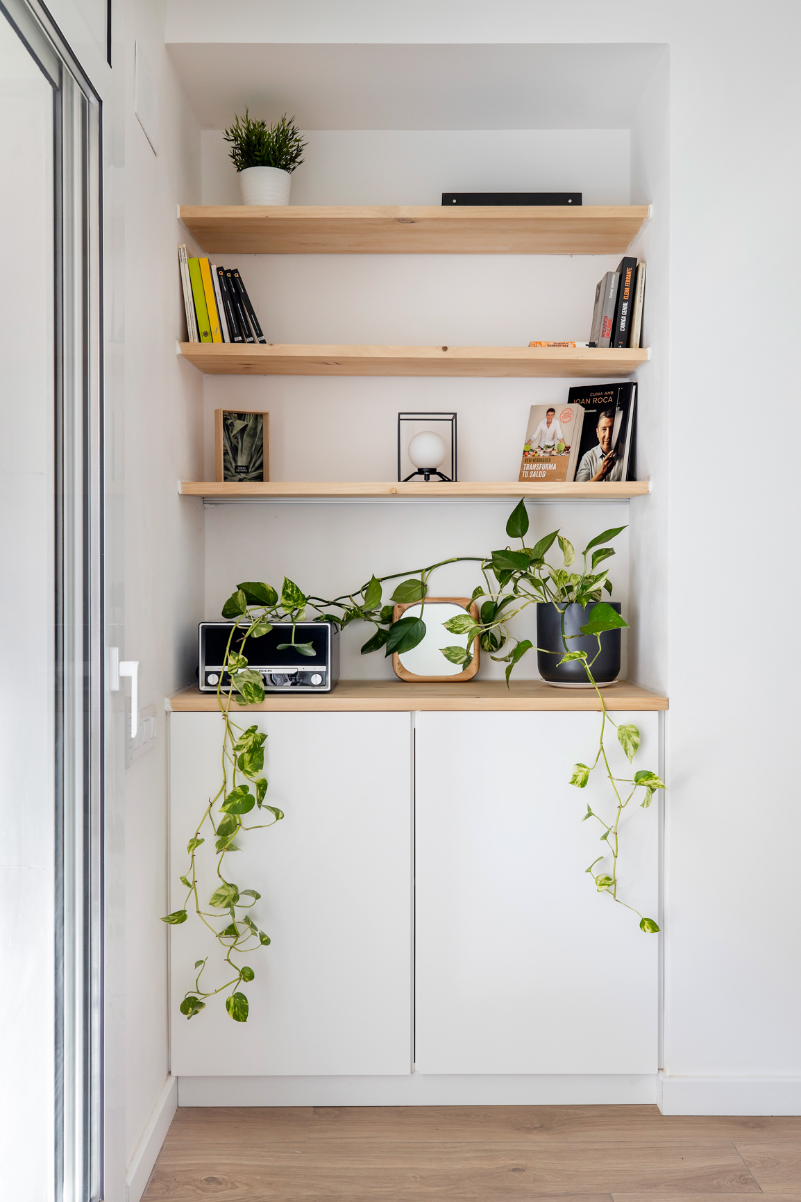 La petita cuina que donava a pati interior d’edifici, s’amplia i s’obre cap a la sala i lateralment a través d’unes grans portes corredisses de vidre i fusta, obrint l’espai visualment i fent desaparèixer les parets del antic passadís. A l’únic tros restant de paret de passadís el que fem es crear una estanteria encastada convertint aquest espai de pas en un racó d’emmagatzematge amb llum indirecta col·locant-hi unes tires LED sota les baldes.