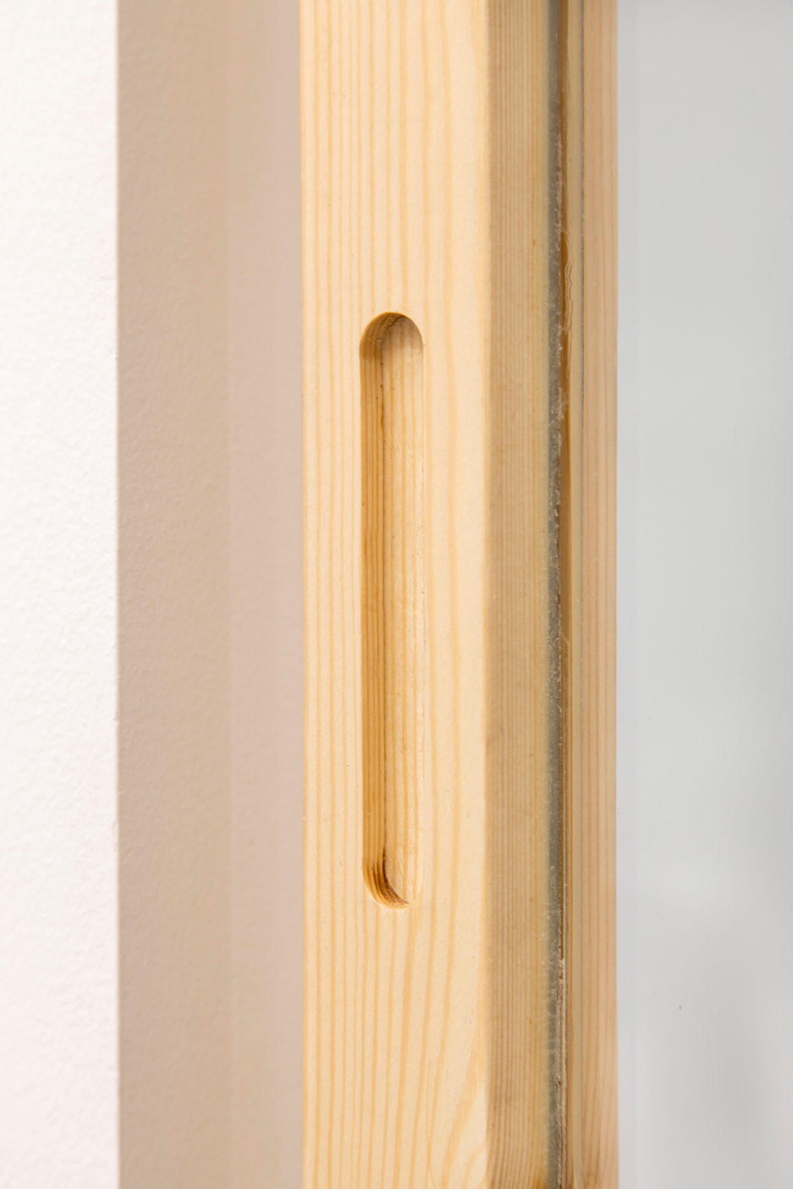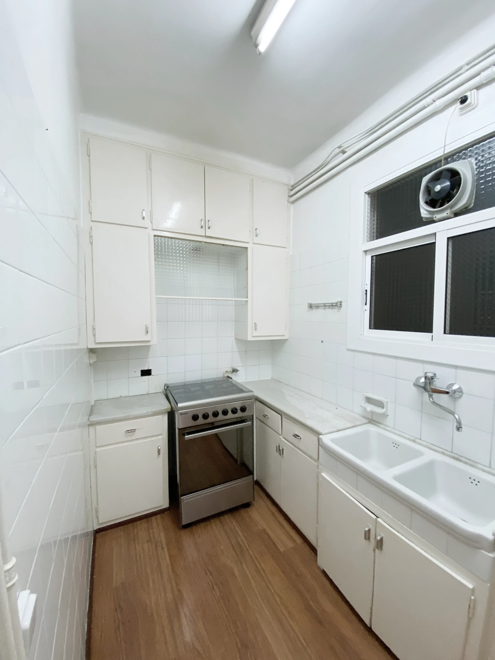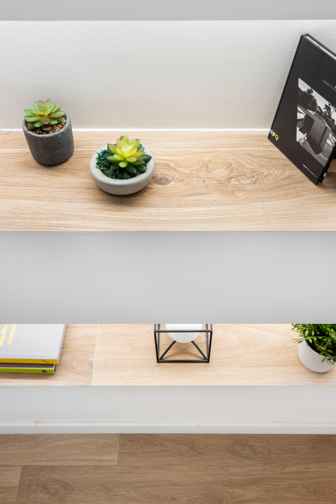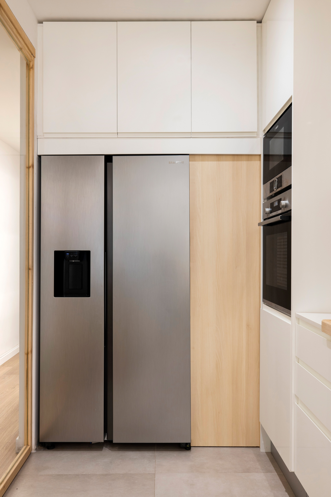 La petita cuina que donava a pati interior d’edifici, s’amplia i s’obre cap a la sala i lateralment a través d’unes grans portes corredisses de vidre i fusta, obrint l’espai visualment i fent desaparèixer les parets del antic passadís. A l’únic tros restant de paret de passadís el que fem es crear una estanteria encastada convertint aquest espai de pas en un racó d’emmagatzematge amb llum indirecta col·locant-hi unes tires LED sota les baldes.