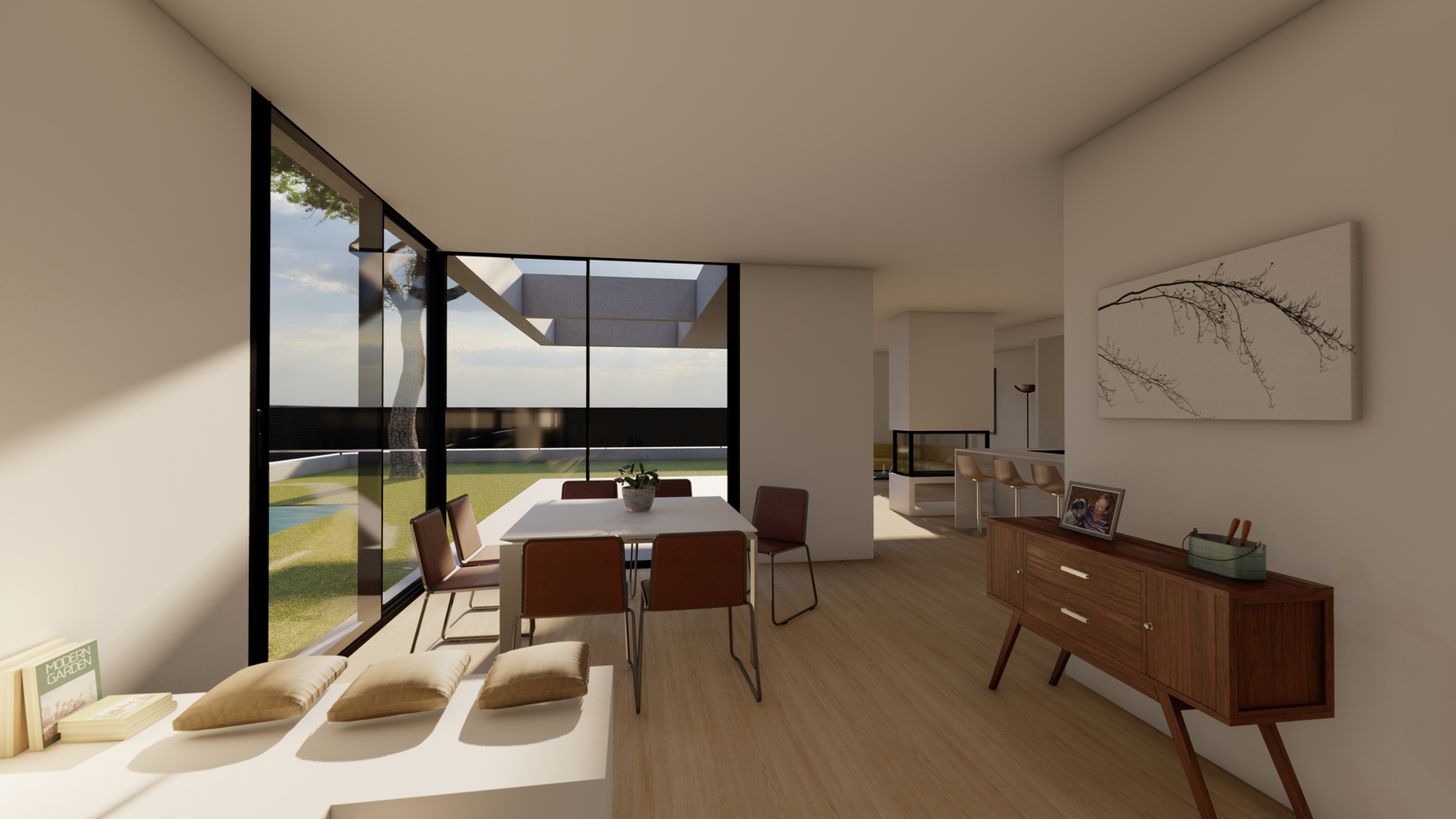 The day zone, located primarily on the ground floor, is designed based on an open-plan concept where the kitchen acts as the central hub connecting the living and dining areas. All these spaces enjoy views towards the exterior porch, the garden, and the new swimming pool. The night zone, containing the bedrooms and bathrooms, is situated within the refurbished house, with openings positioned at the rear to ensure greater privacy. Finally, the master suite and dressing room are located on the first floor, with access to a new terrace created atop the roof of the extension.