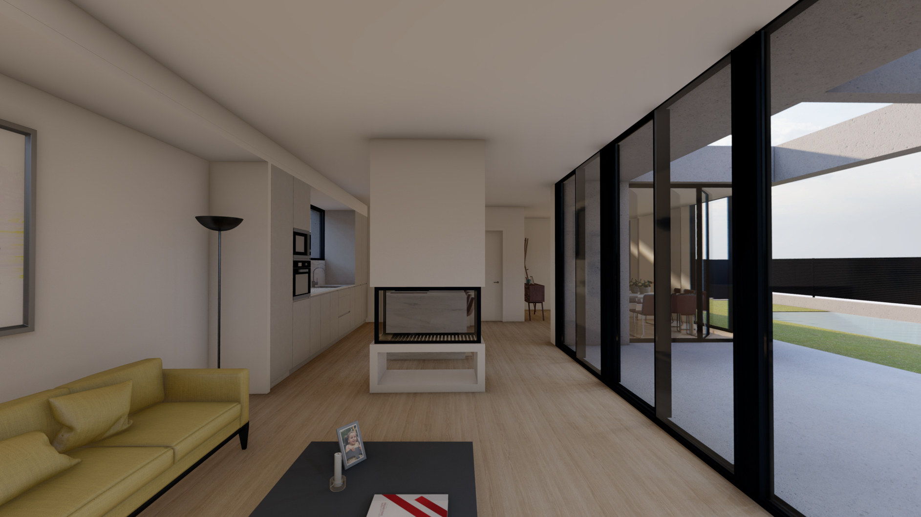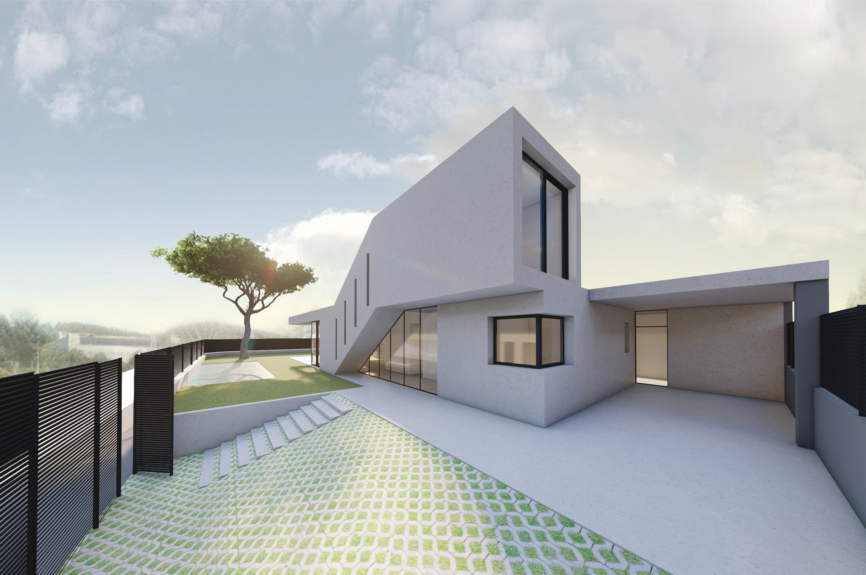 Regarding materiality, the existing house retained its original finish, which was repaired and painted white. In contrast, the extension was constructed in exposed concrete, clearly distinguishing the old from the new whilst maintaining a clear harmony across the ensemble.